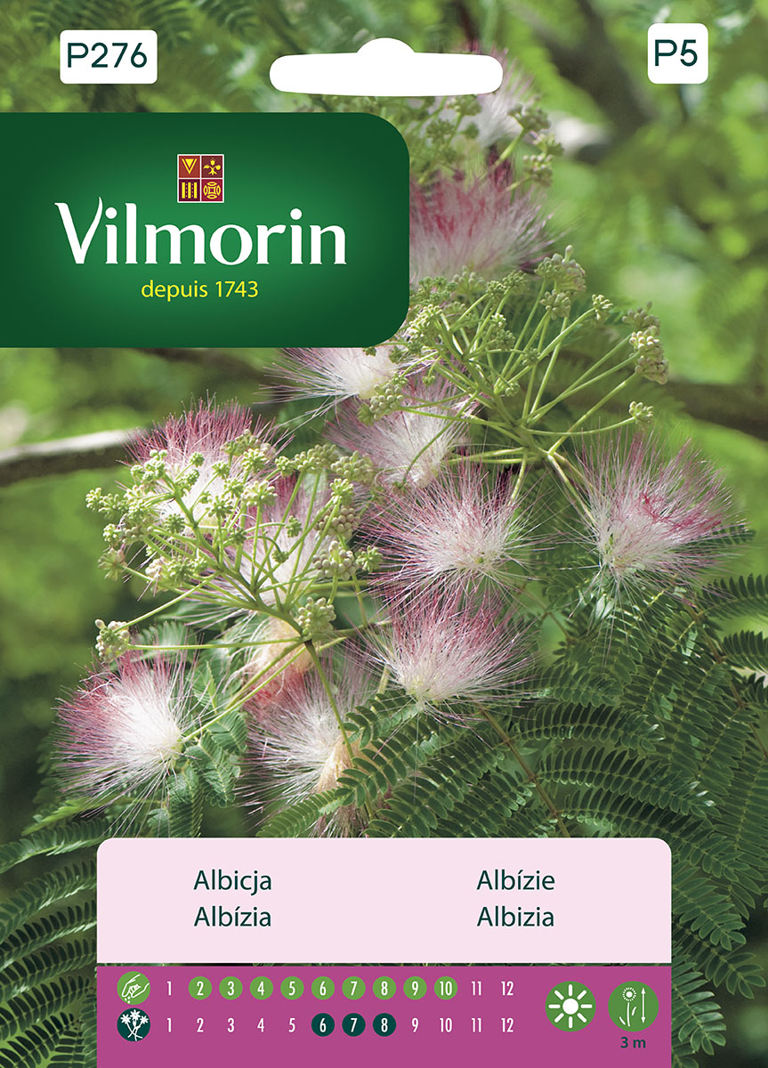A tree with dark green fern-like leaves and extraordinary crest-like inflorescences. Called silk tree. Purpose: Grown in flower boxes as interior decoration. May be kept on the terrace since May. Hint: Drench seeds for 24h before sowing.