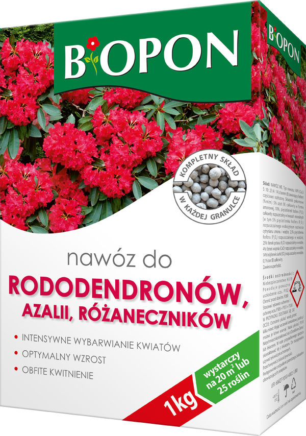 Rośliny zasilane nawozem BIOPON do rododendronów, azalii i różaneczników są obsypane